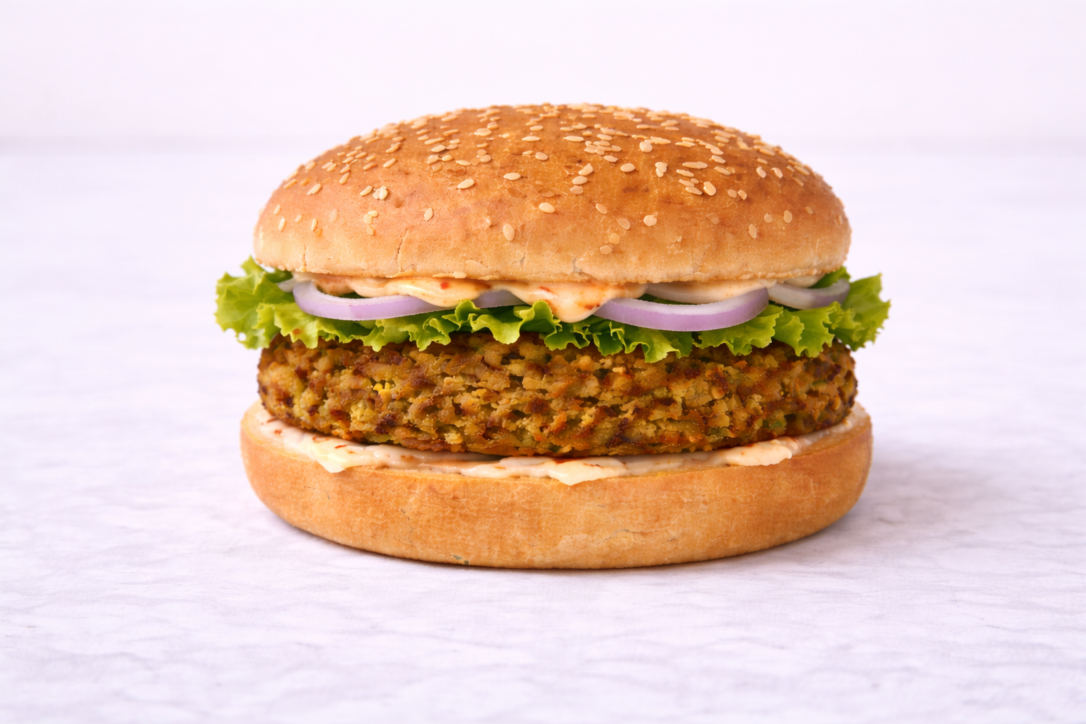 Our Veggie Royale Burger features a perfectly seasoned veg patty layered with fresh lettuce, onions, and our signature house-made eggless mayo, all tucked inside a soft, lightly toasted bun. Balanced, comforting, and satisfying—this one never goes out of style.